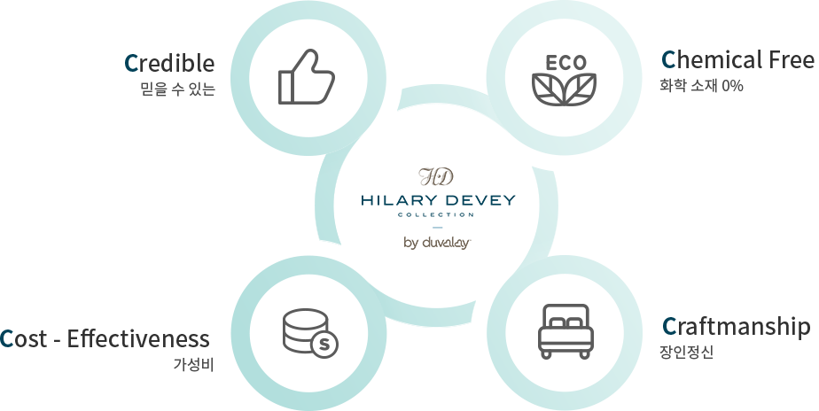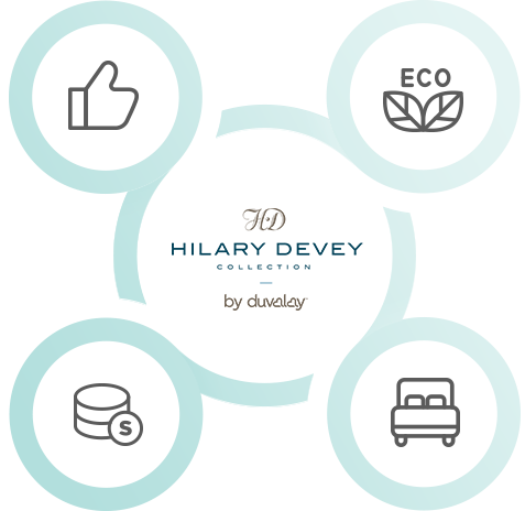 Duvalay 사의 매트리스 제조 기술과 영국 상류층을 대표하는 Hilary Devey CBE의 안목이 모여 '럭셔리 매트리스의 보급화'와 '전통 수 제작 매트리스의 르네상스' 라는 철학으로 Hilary Devey Collection이 론칭 되었습니다.