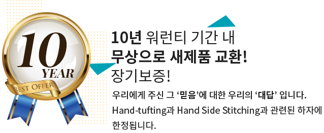 Hilary Devey Collection의 모든 제품은 영국의 전통 수 제작 방식으로 제조가 되어지고 있습니다. 공장에서 기계화 설비로 대량 생산 되는 여느 브랜드와 다르게 견고한 마감을 자랑합니다. Hilary Devey Collection은 영국의 전통 매트리스 제조 방식을 자부하며, 이에 10년의 품질 보증 기간을 제공합니다. 제품 하자 시 국내에서 AS를 할 수 있는 기술자가 없는 관계로 보증 기간 동안 하자에 대해 100% 새 제품으로 교환해 드리고 있습니다.