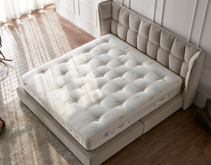 매트리스 내부 소재 모두 천연 소재이기에 레이어드 고정을 위하여 여느 매트리스와 달리 화학 본드를 사용하지 않고, 대바늘을 이용하여 매트리스의 옆면을 관통하여 안에 위치한 스프링과 단단히 고정을 시키는 작업으로 매트리스의 측면이 오랜 시간 사용에도 강한 서포트를 유지합니다.
