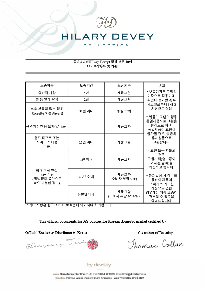 | 핸드 터프트 또는 사이드 스티칭 파손 | 10년 이내 | 제품 교환 |